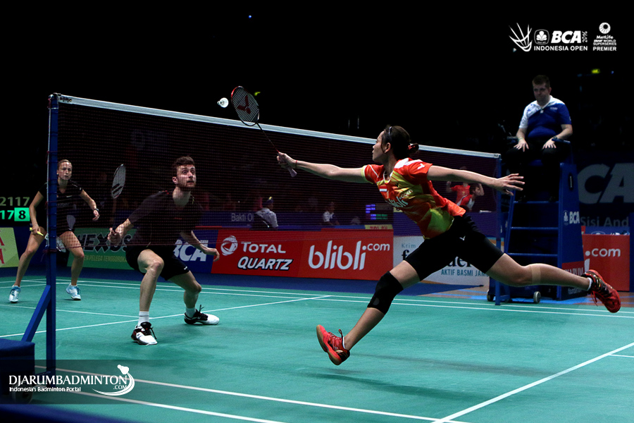 Alfian Eko Prasetya/Annisa Saufika (Indonesia) menyambar pengembalian tanggung