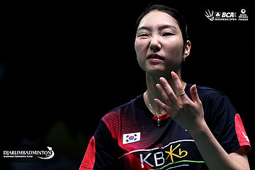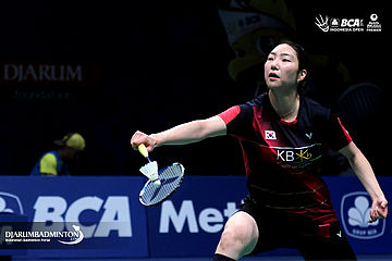 Sung Ji Hyun (Korea) mengembalikan shuttlecock