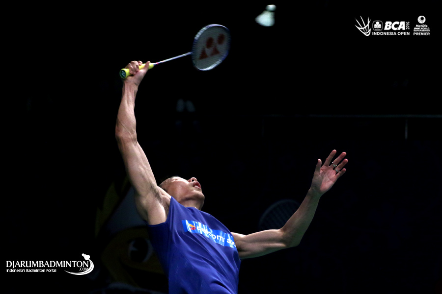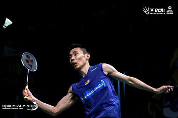 Lee Chong Wei (Malaysia) melepaskan serangan