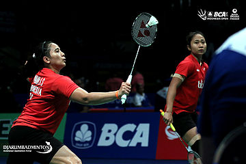 Anggia Shita Awanda/Ni Ketut Mahadewi (Indonesia) menghadang serangan