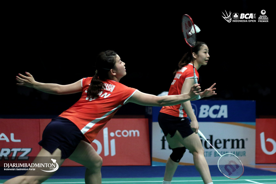 Ayaka Takahashi/Misak Matsutomo (Jepang) mengembalikan shuttlecock