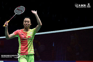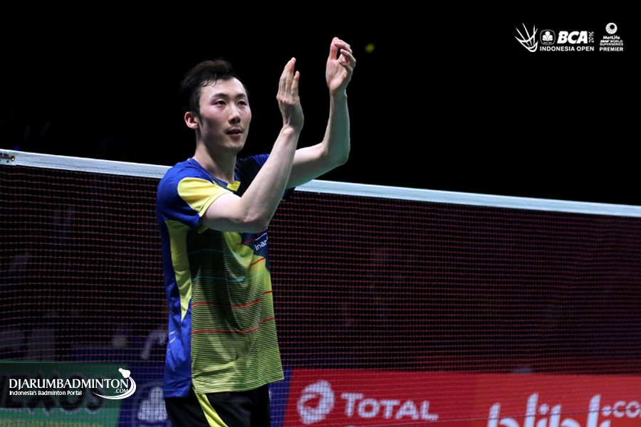 Zhao Yunlei (Tiogkok) memberikan apresiasi kepada seluruh supporter yang memadati Istora Senayan, Jakarta