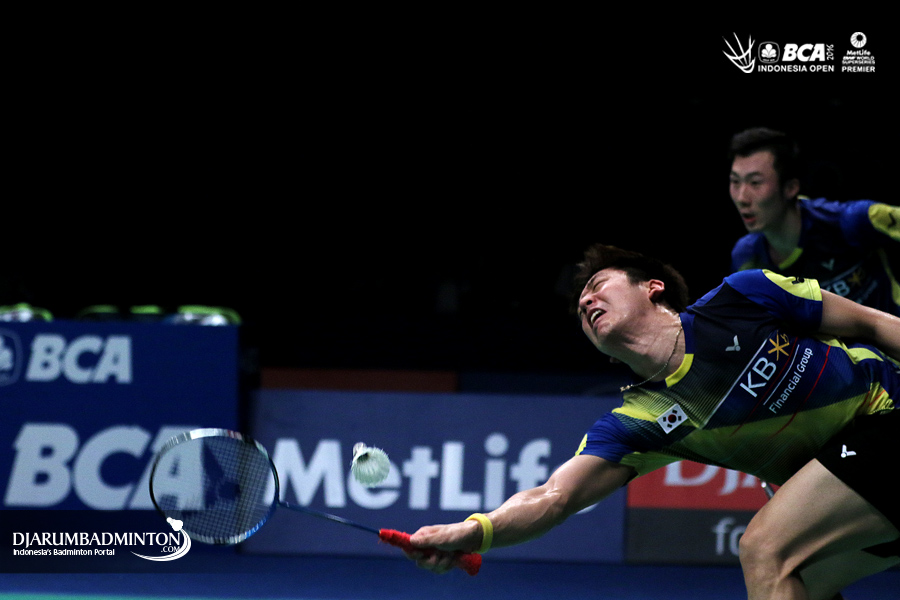 Lee Yong Dae/Yoo Yeong Seong (Korea) menghadang serangan