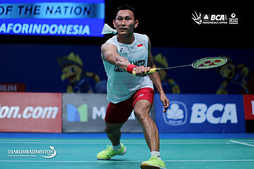 Sony Dwi Kuncoro (Indonesia) mengembalikan shuttlecock