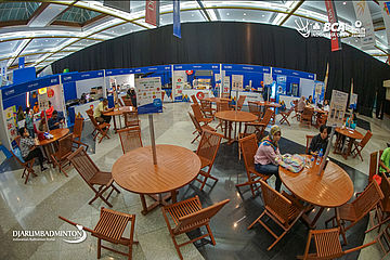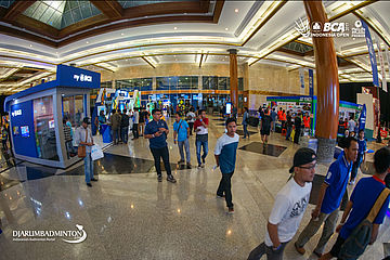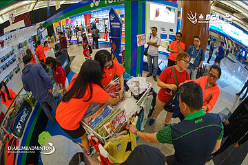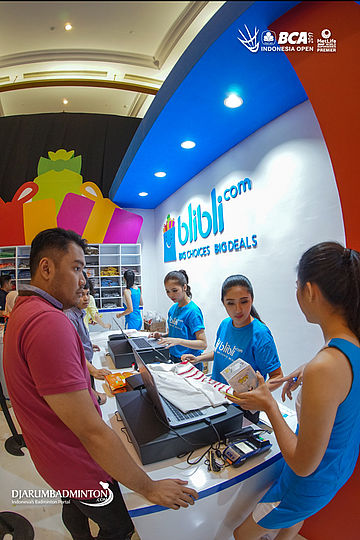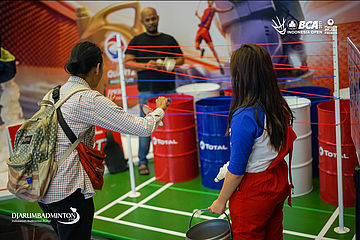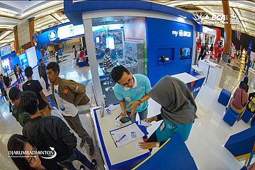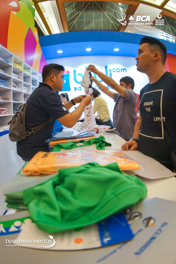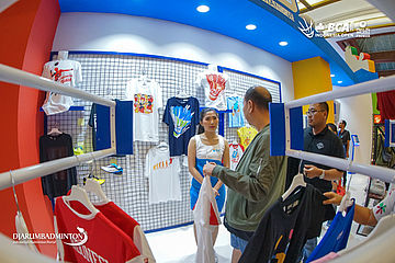 Pengunjung memilih perlengkapan badminton di booth Yonex