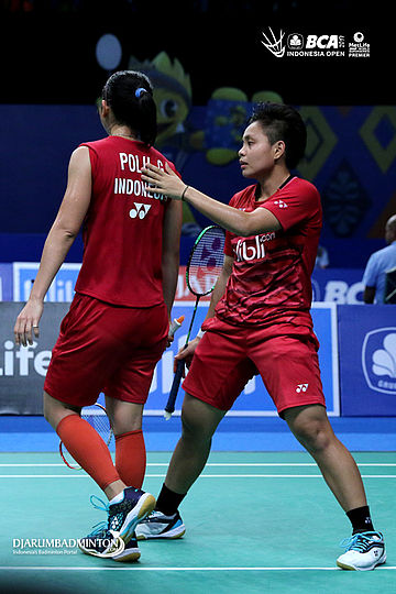 Apriyani Rahayu/Greysia Polii (Indonesia) saling memberikan semangat
