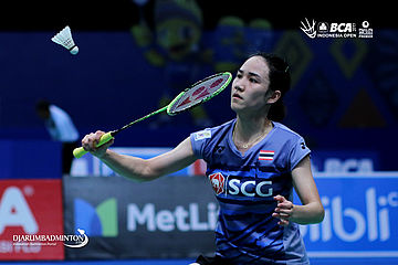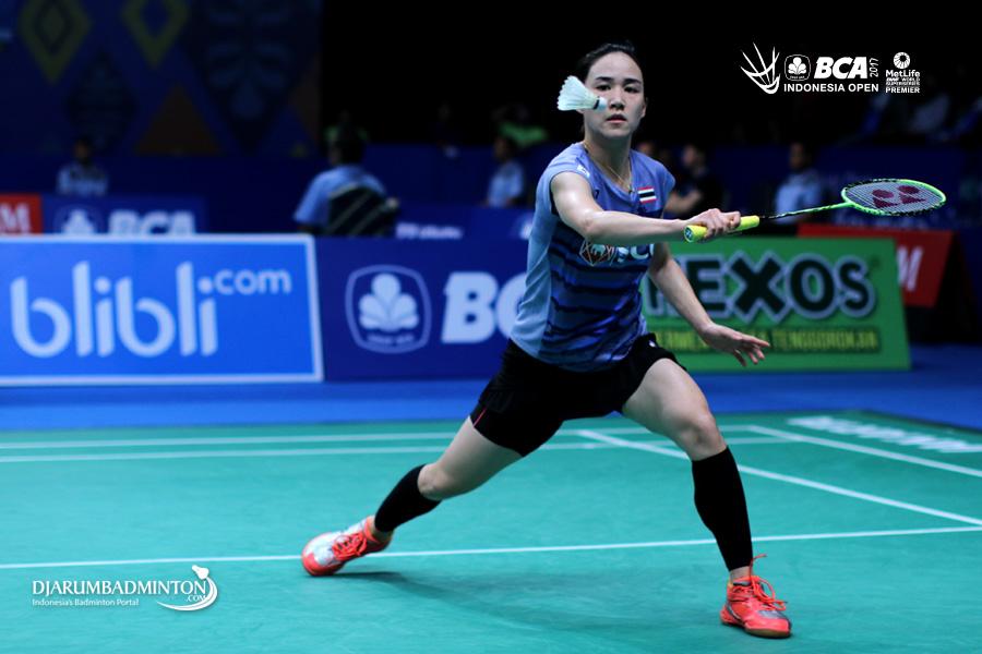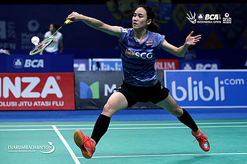 Nitchaon Jindapol (Thailand) mengembalikan shuttlecock
