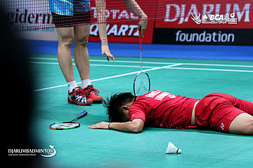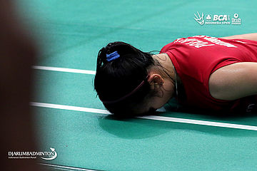 Apriyani Rahayu (Indonesia) terjatuh saat berusaha menyelamatkan shuttlecock