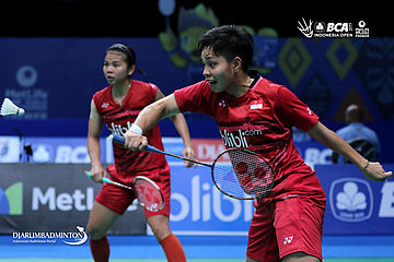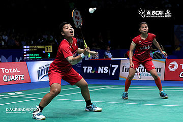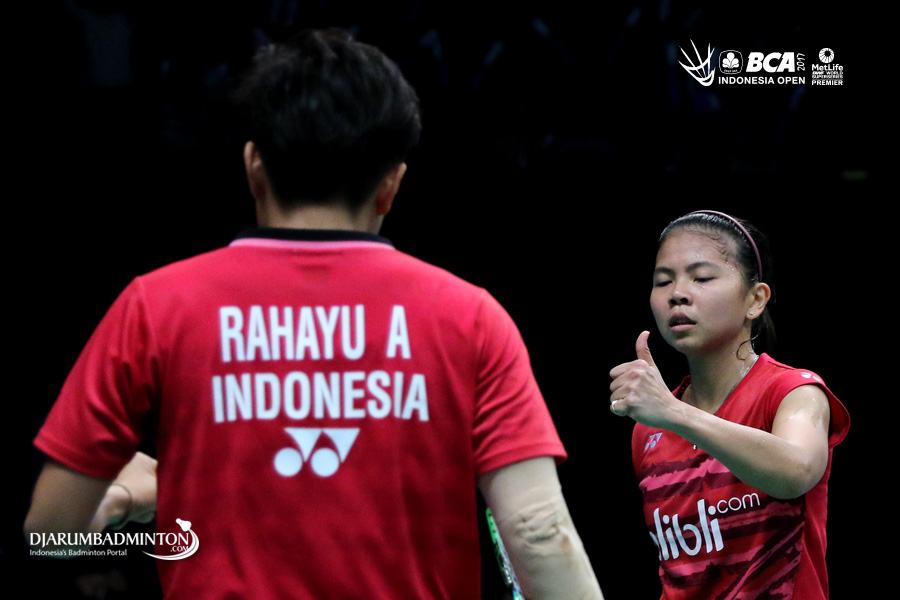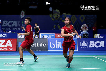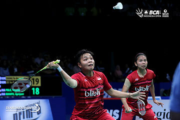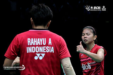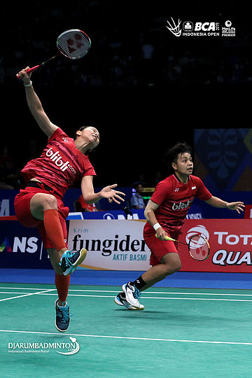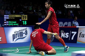 Apriyani Rahayu/Greysia Polii (Indonesia) menyambut pengembalian