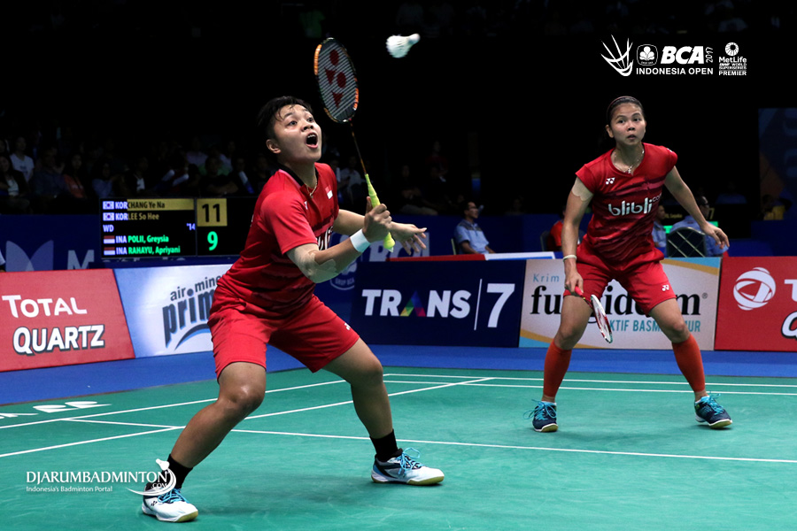 Apriyani Rahayu/Greysia Polii (Indonesia) bersiap menghadang serangan