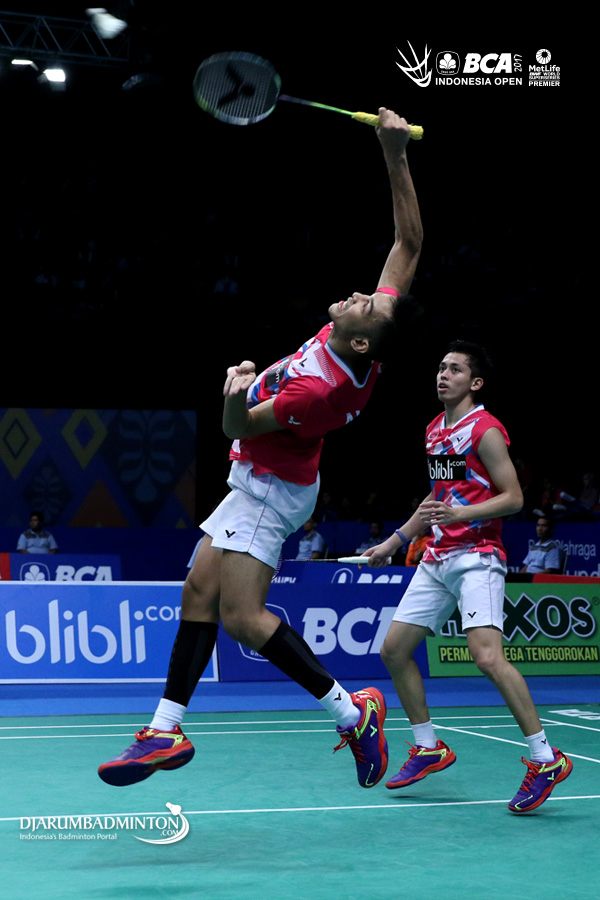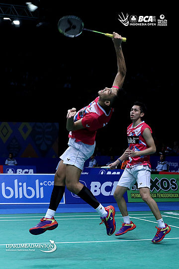 Fajar Alfian/Muhammad Rian Ardianto (Indonesia) melepaskan serangan