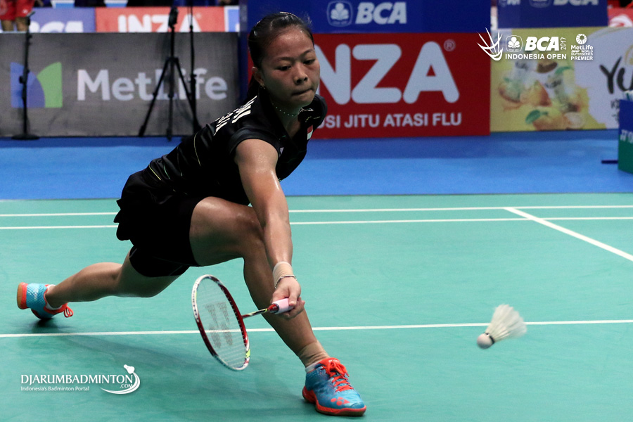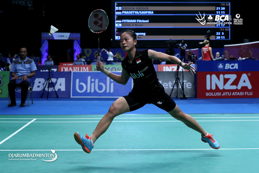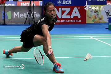 Fitriani (Indonesia) berusaha mengembalikan shuttlecock