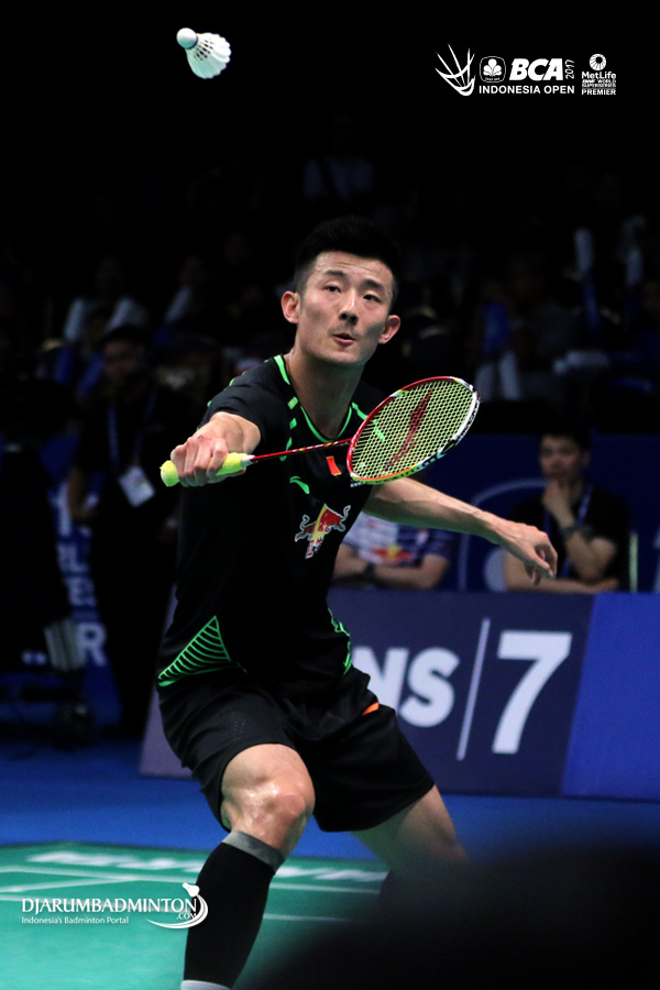Chen Long (Tiongkok) mengembalikan shuttlecock