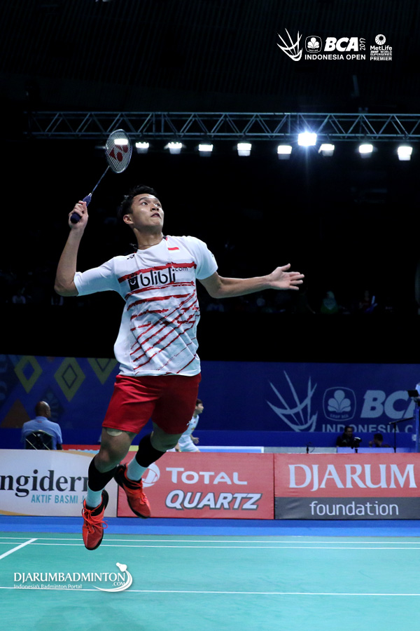 Jonatan Christie (Indonesia) bersiap melepaskan smash