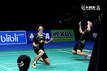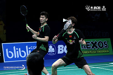 Li Junhui/Liu Yuchen (Tiongkok) mengembalikan shuttlecock