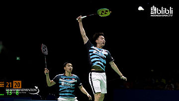 Marcus Fernaldi Gideon/Kevin Sanjaya Sukamuljo (INA) menyambut pengembalian