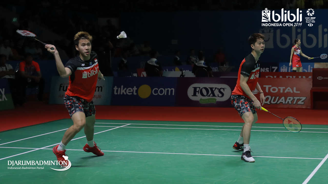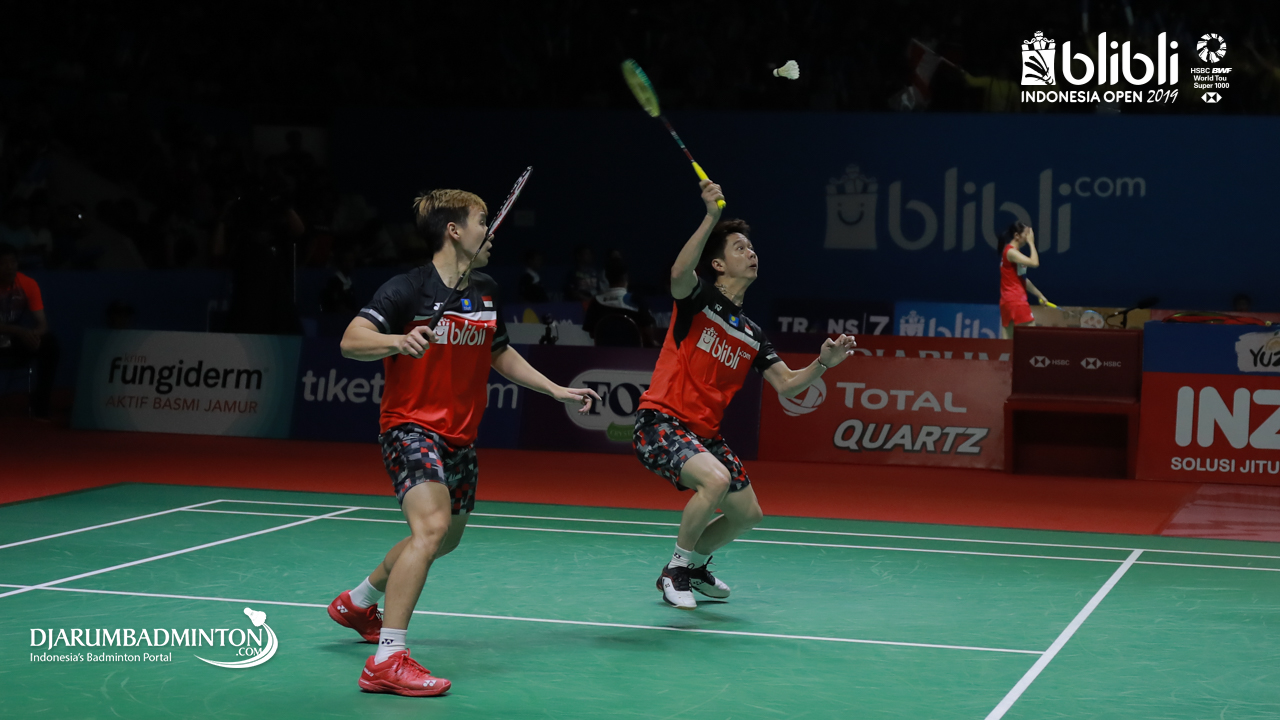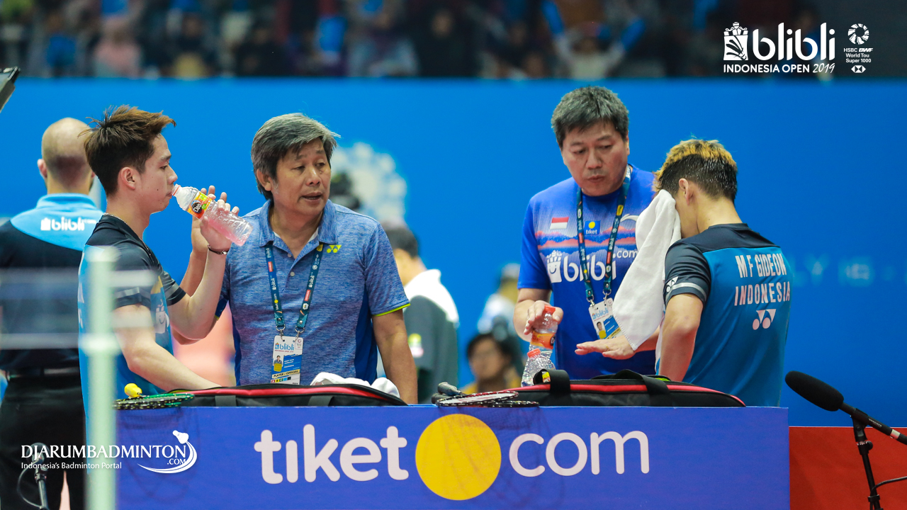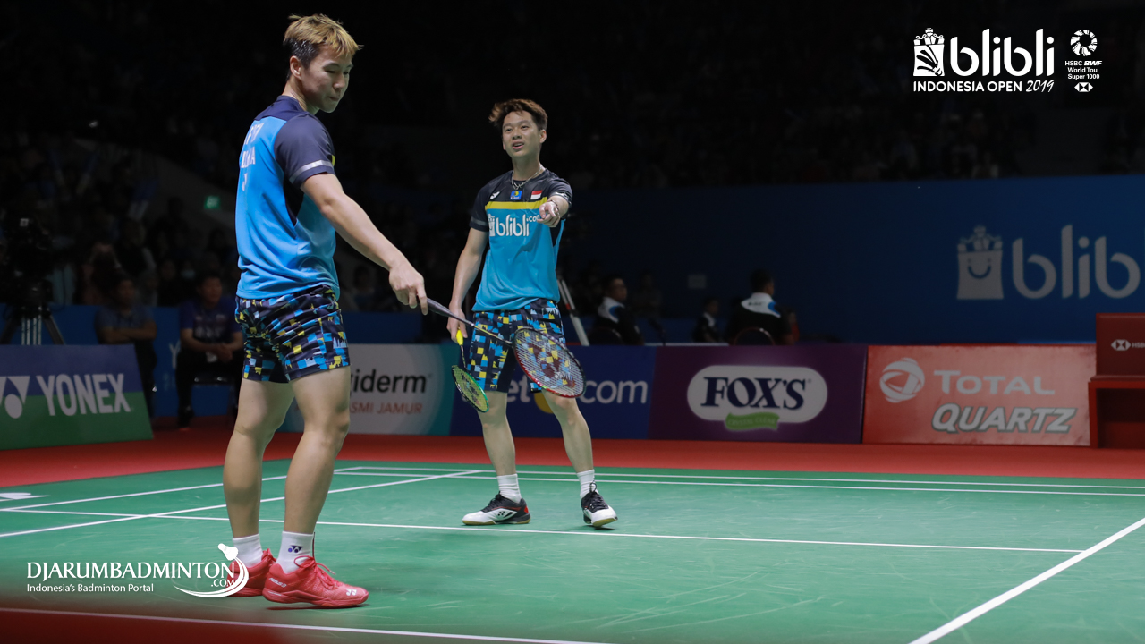 Marcus Fernaldi GIDEON/Kevin Sanjaya SUKAMULJO (Indonesia) melakukan perotes