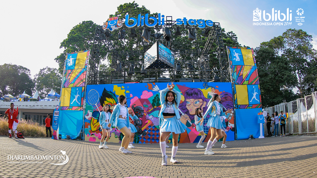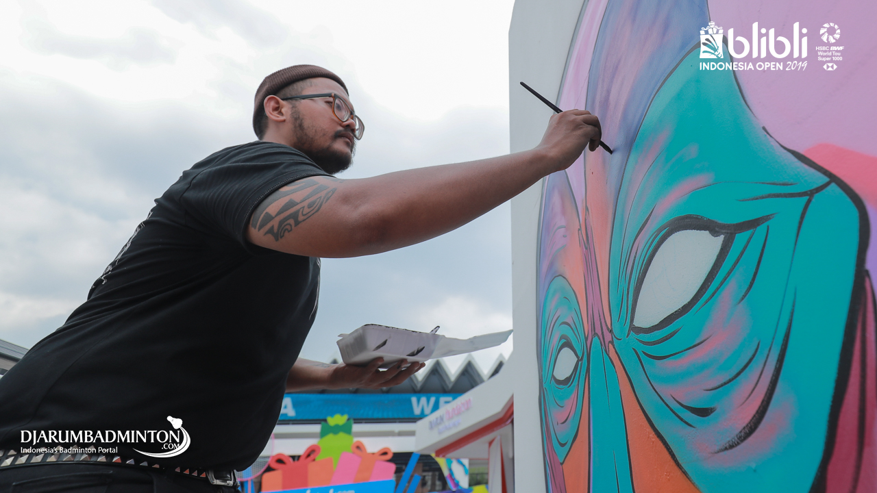 Salah seorang sedang membuat mural di area Blibli Indonesia Open 2019