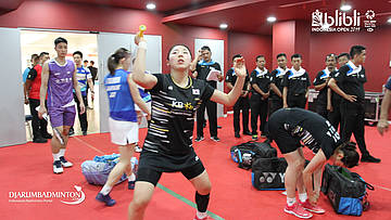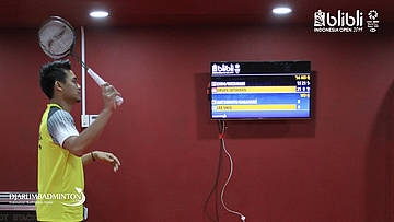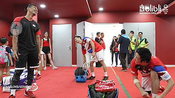 Tontowi Ahmad melakukan pemanasan di Players Services