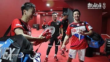 M Ahsan berbincang dengan Hiroyuki Endo (kanan) dan Yuta Watanabe saat melakukan persiapan di Players Services