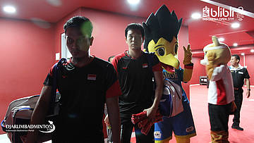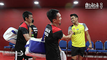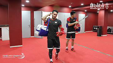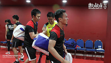Hendra Setiawan dan M Ahsan melakukan persiapan di Players Services