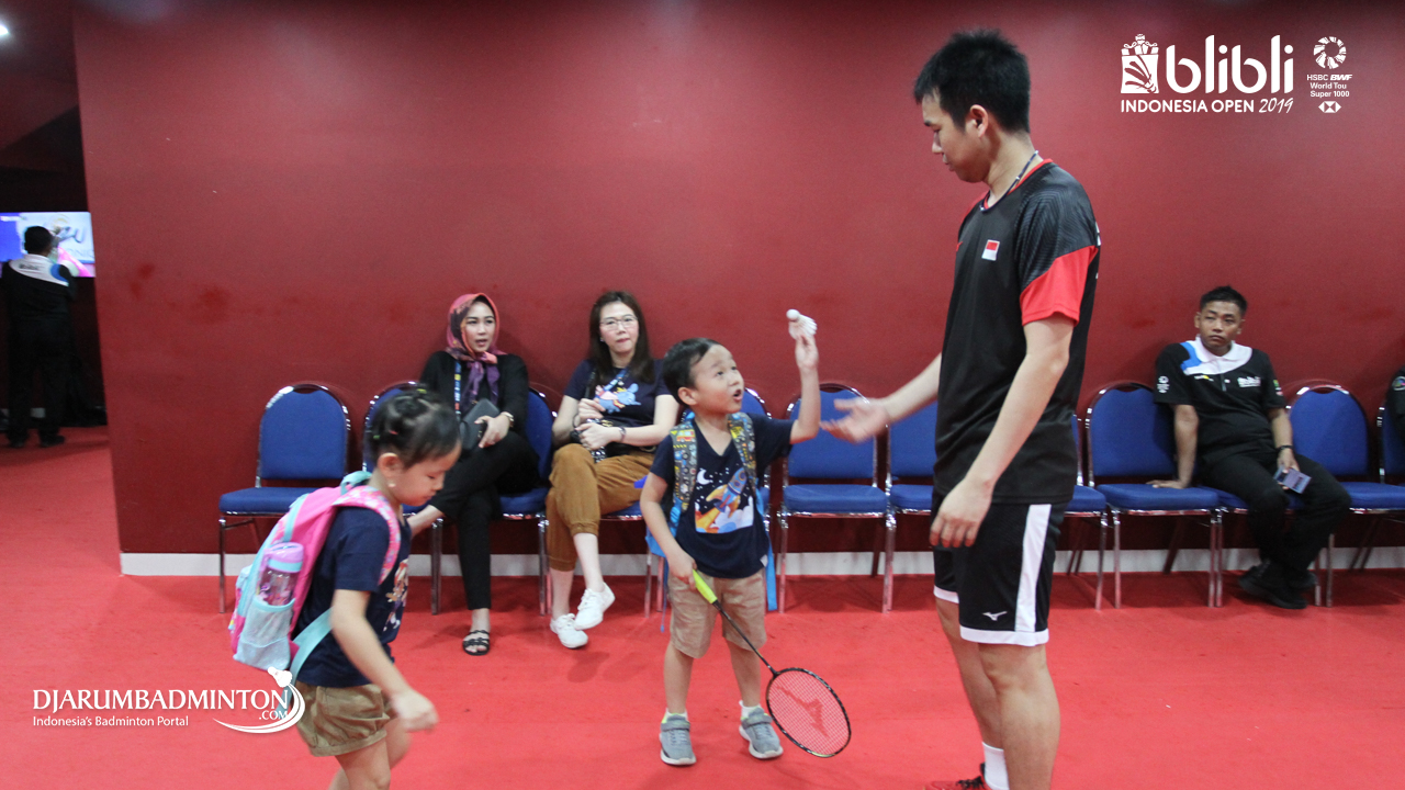 Anak dan istri Hendra Setiawan melihat persiapan M Ahsan di Players Services