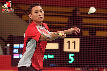 Pemain Indonesia, Sony Dwi Kuncoro berusaha mengembalikan kok ke arah pemain India, Anand Pawar di babak kualifikasi pertama Djarum Indonesia Open 2012.