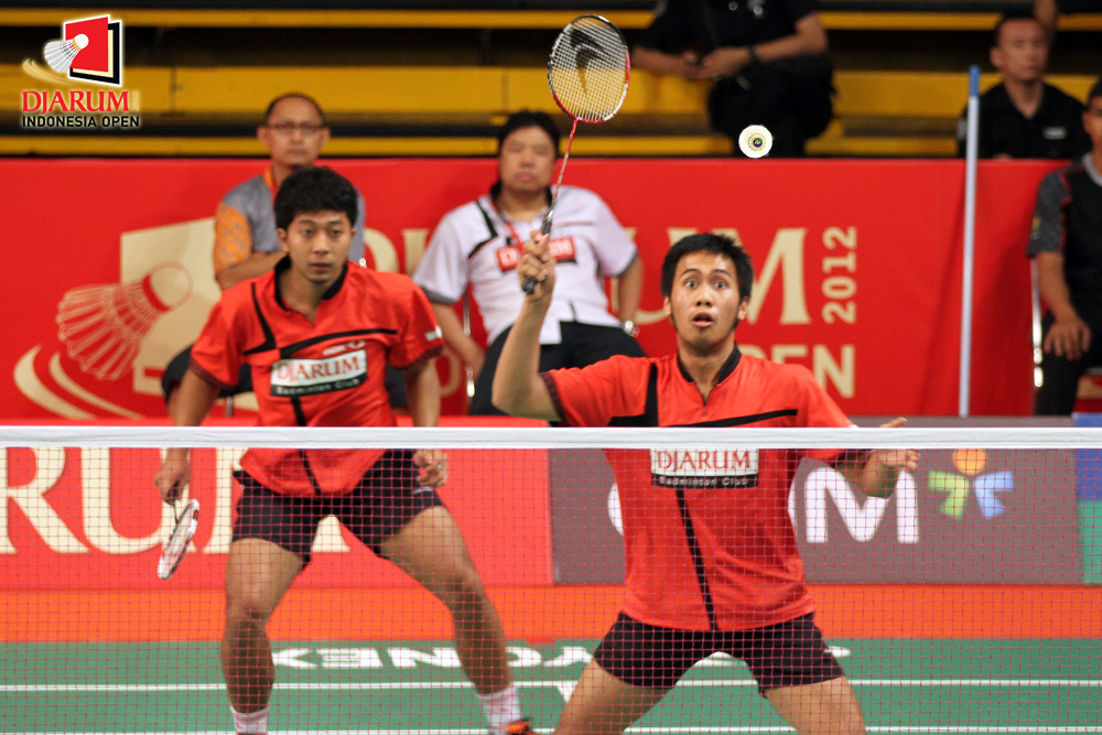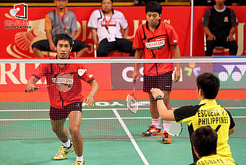 Pasangan Rangga Yave Rianto/Kusdianto Seiko Wahyu bersiap menerima kok dari pasangan asal Filipina, Philip Joper/Magnaye Peter di babak kualifikasi pertama Djarum Indonesia Open 2012.