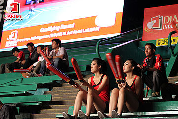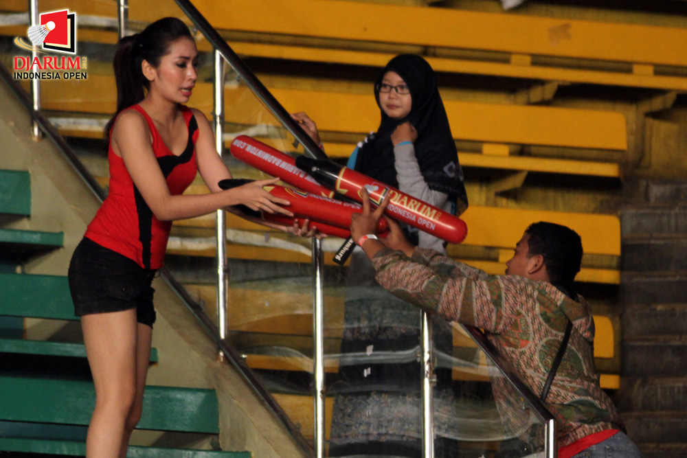 Usher yang bertugas di Djarum Indonesia Open 2012 memberikan semangat kepada pemain Indonesia.