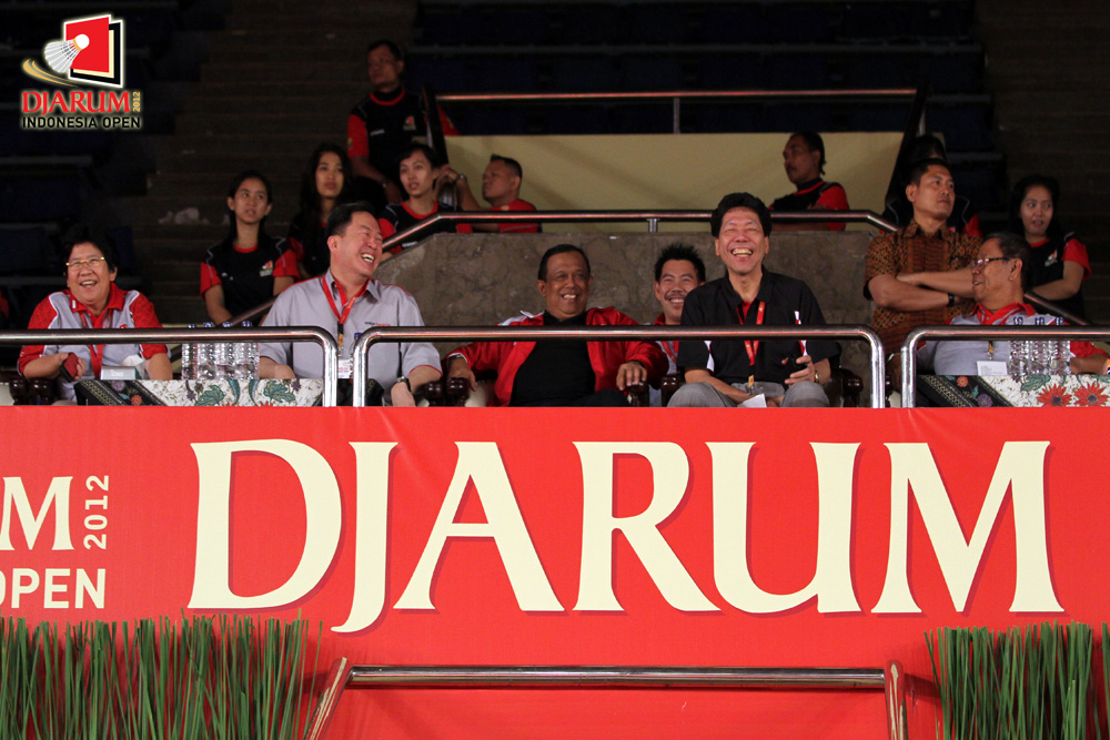 Ketua Umum PB PBSI, Djoko Santoso (tengah) tengah bersendau gurau dengan pengurus PBSI lainnya kala menyaksikan babak kualifikasi pertama Djarum Indonesia Open 2012.