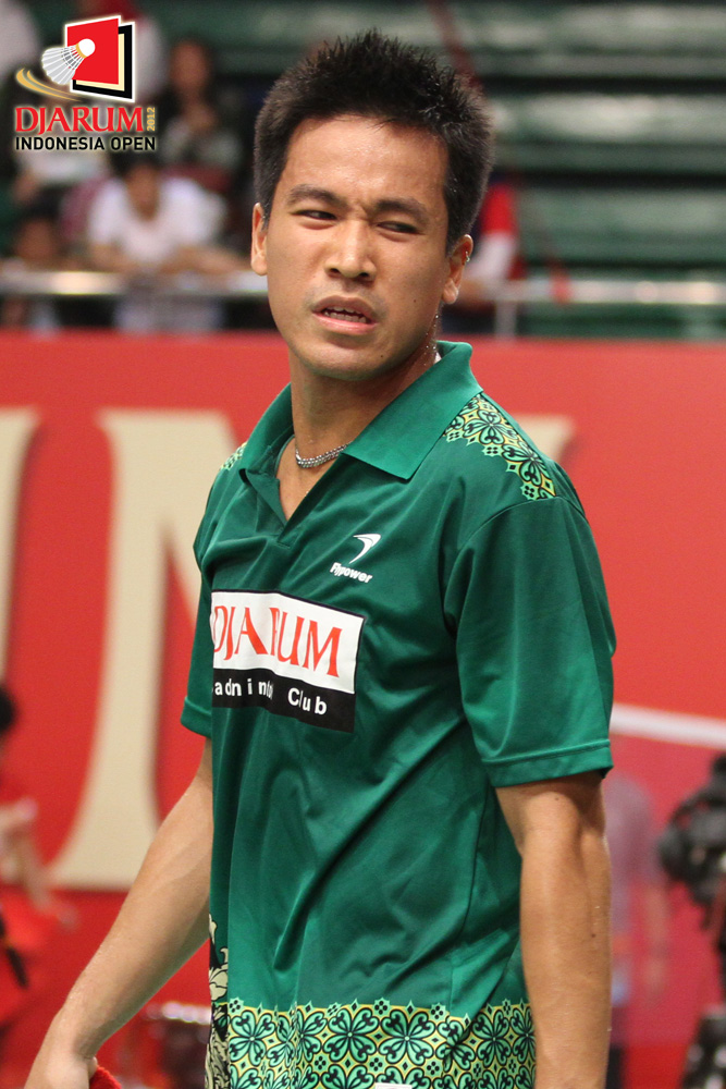 Ekspresi Andre Kurniawan Tedjono kala gagal melayangkan kok ke arah pemain asal India, Sai Praneeth di babak kualifikasi pertama Djarum Indonesia Open 2012.