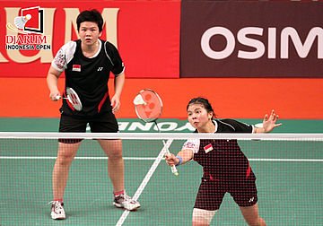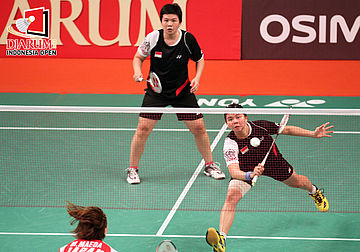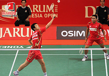 Pasangan Indonesia, Hendra Setiawan/Markis Kido berusaha mengembalikan kok ke arah rekan setimnya di Indonesia, Rendra Wijaya/Rian Sukmawan.