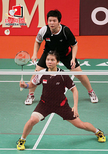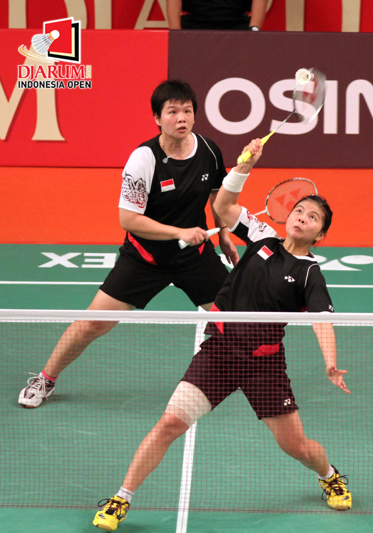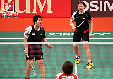 Pasangan Indonesia, Greysia Polii/Meiliana Jauhari berusaha mengembalikan kok ke arah pasangan Jepang, Miyuki Maeda/Satoko Suetsuna.