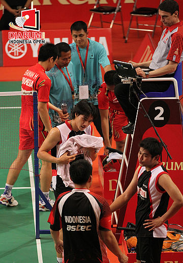 Pasangan Indonesia, Rendra Wijaya/Rian Sukmawan ketika tengah berlaga melawan rekan setimnya di Indonesia, Hendra Setiawan/Markis Kido.