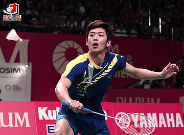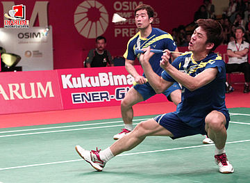 Pemain Korea Selatan, Lee Yong Dae berusaha mengembalikan kok ke arah pasangan Denmark, Carsten Mogensen/Mathias Boe.