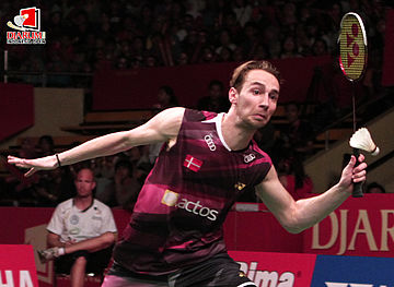 Pemain Denmark, Mathias Boe berusaha mengembalikan kok ke arah pasangan Korea Selatan, Jung Jae Sung/Lee Yong Dae.