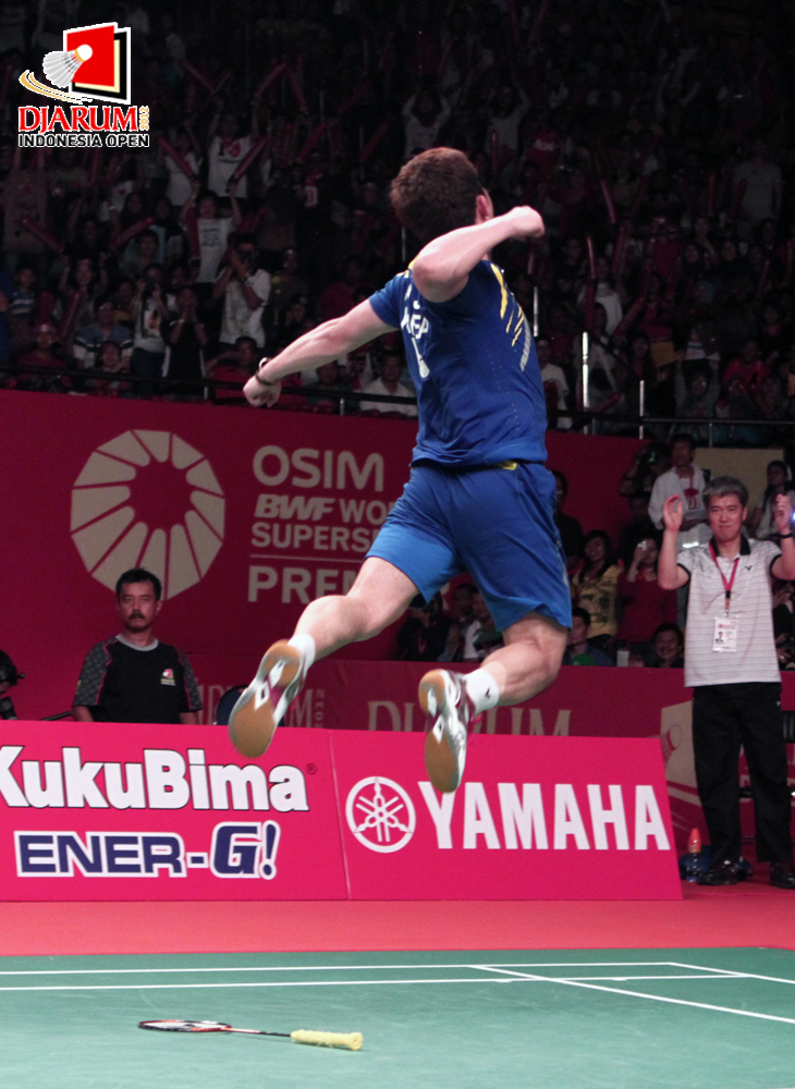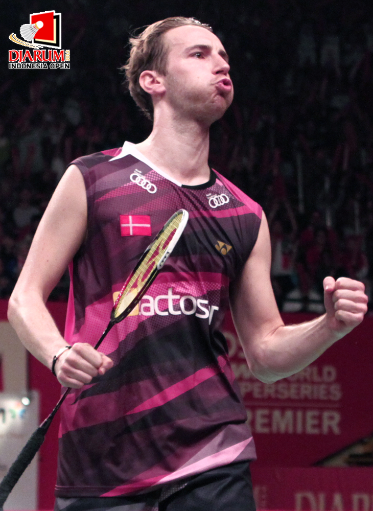 Ekspresi pemain Denmark, Mathias Boe usai merai poin ketika menghadapi pasangan Korea Selatan, Jung Jae Sung/Lee Yong Dae.
