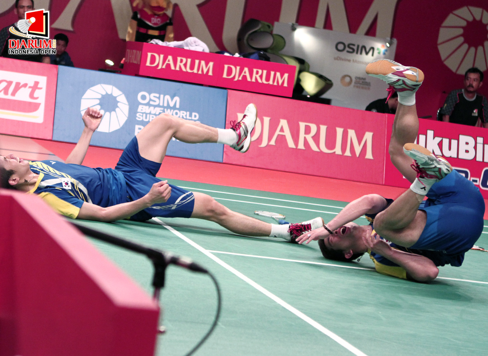 Selebrasi pasangan Korea Selatan, Jung Jae Sung/Lee Yong Dae, usai menang atas pasangan Denmark, Carsten Mogensen/Mathias Boe.