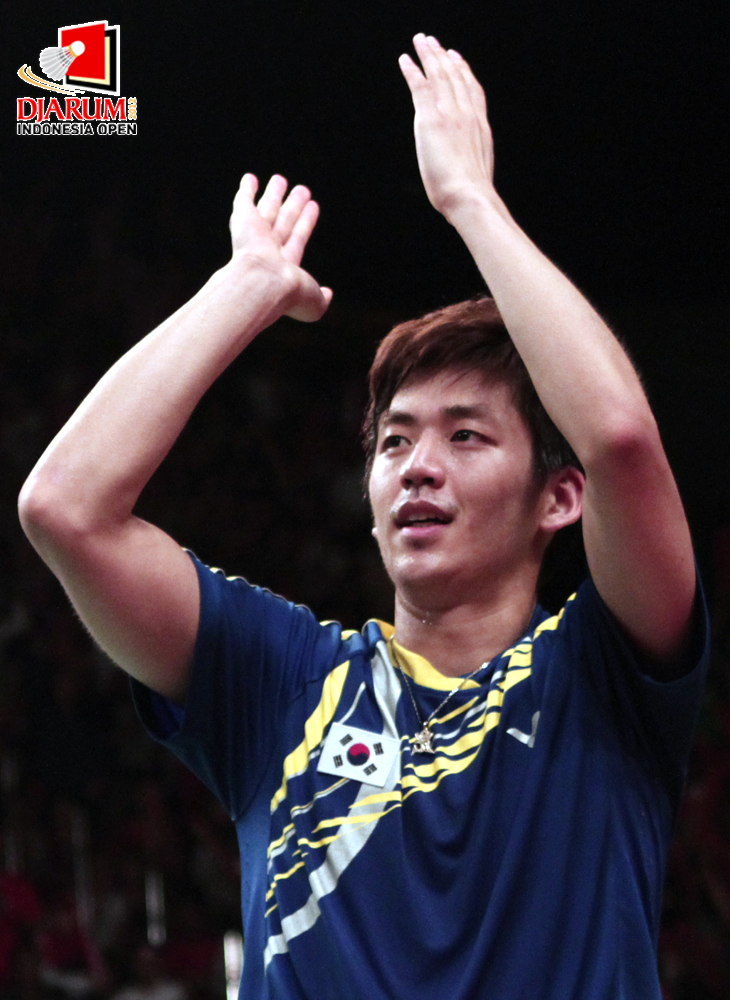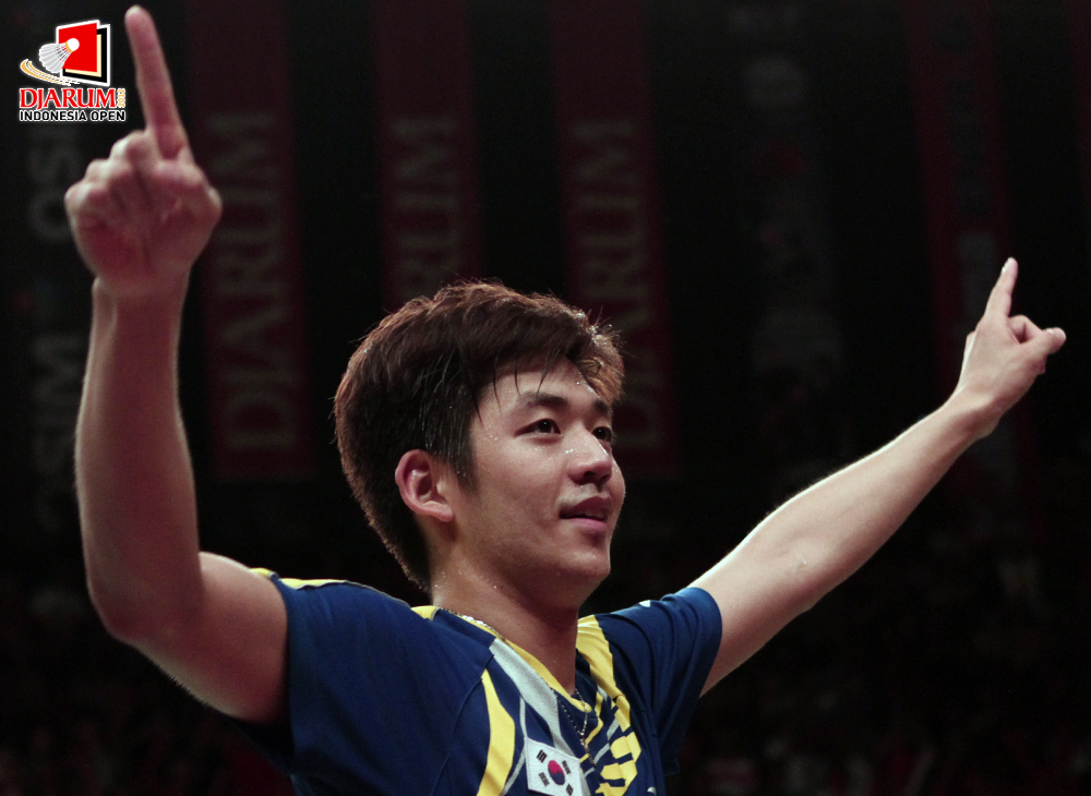 Selebrasi pemain Korea Selatan Lee Yong Dae, usai menang atas pasangan Denmark, Carsten Mogensen/Mathias Boe.