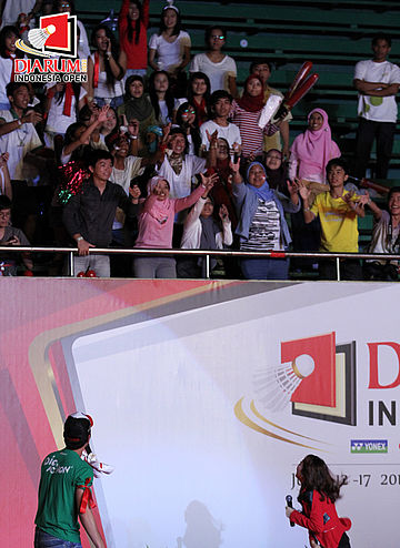 Taufik Hidayat memberikan tanda tangan di sepatu yang dilelang kepada pengunjung yang hadir di Istora Senayan Jakarta.