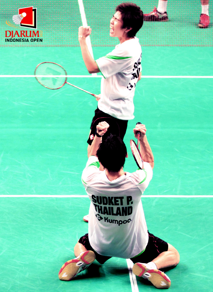 Selebrasi pasangan Thailand, Sudket Prapakamol/Saralee Thoungthongkam usai menang atas pasangan Indonesia, Tontowi Ahmad/Liliyana Natsir.