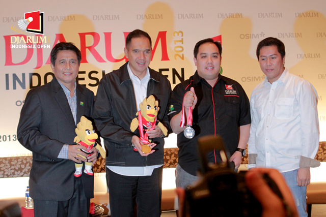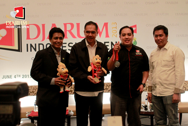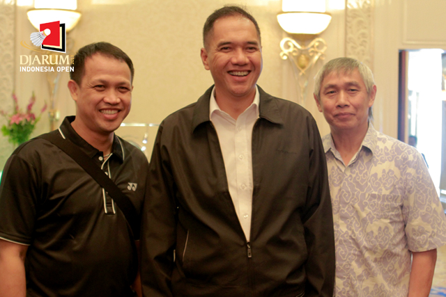 (ki-ka) Rexy Mainaky, Gita Wirjawan, Christian Hadinata berphoto bersama saat press conference Djarum Indonesia Open Super Series Premier 2013
