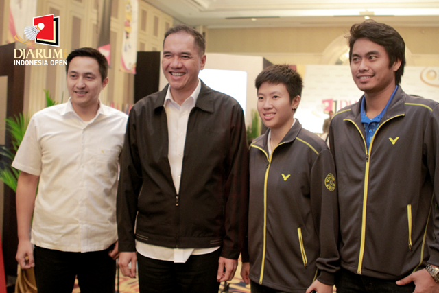 (ki-ka) Ricky Subagja, Gita Wirjawan, Lilyana Natsir dan Tontowi Ahmad berphoto bersama saat press conference Djarum Indonesia Open Super Series Premier 2013