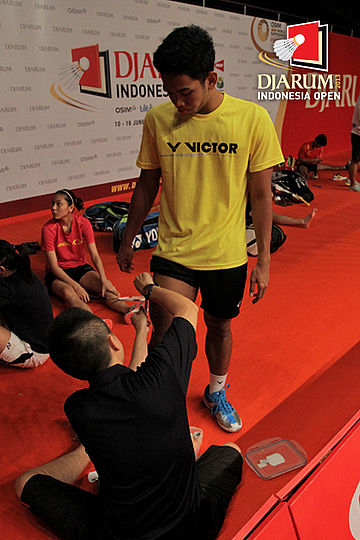 Edi Subaktiar (Indonesia) saat dibantu fisioteraphy untuk memasang tapping.