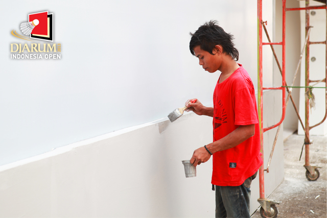 Seorang pekerja tampak sedang mengecat hiasan pintu masuk utama Nations Pride Arena.