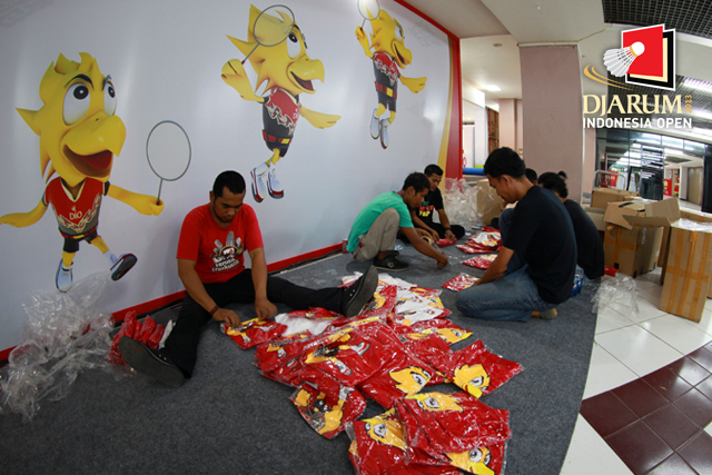 Beberapa pekerja sedang sibuk mengepak kaos Djarum Indonesia Open Super Series Premier 2013 untuk hadiah para pengunjung.