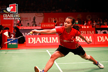 Nitya Krishinda Maheswari/Greysia Polii (Indonesia) mengembalikan shuttlecock ke arah pasangan ganda putri asal Indonesia, Gebby Ristiyani Imawan/Tiara Rosalia Nuraidah.
