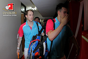 Chris Adcock/Andrew Ellis (Inggris) saat akan memasuki lapangan pertandingan.