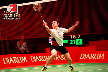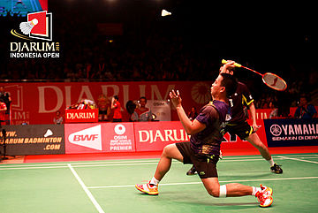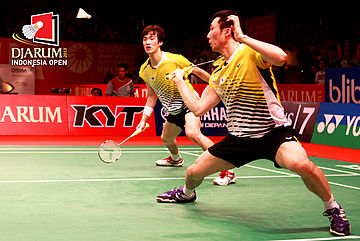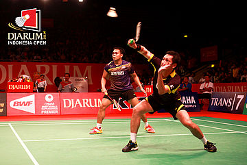 Alvent Yulianto Chandra/Markis Kido (Indonesia) bersiap mengembalikan shuttlecock ke arah Shin Baek Choel/Yoo Yeon Seong (Korea Selatan).