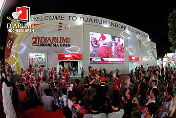 Penampilan salah satu vokalis band saat menghibur parapengunjung Djarum Indonesia Open Super Series 2013.